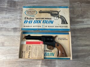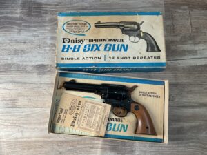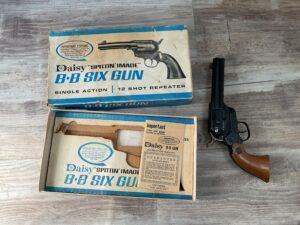 Up for sale today is a Daisy Model 179 Spittin’ Image Pistol with original box. The pistol has a western wood grain molded grip. Smooth bore steel barrel, single action, 12 shot .
